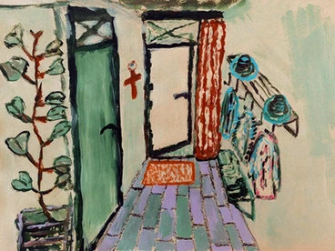 Grandpa opens the door. I look around and try to avoid his penetrating gaze. From the kitchen, grandma barrels toward us, shouting.